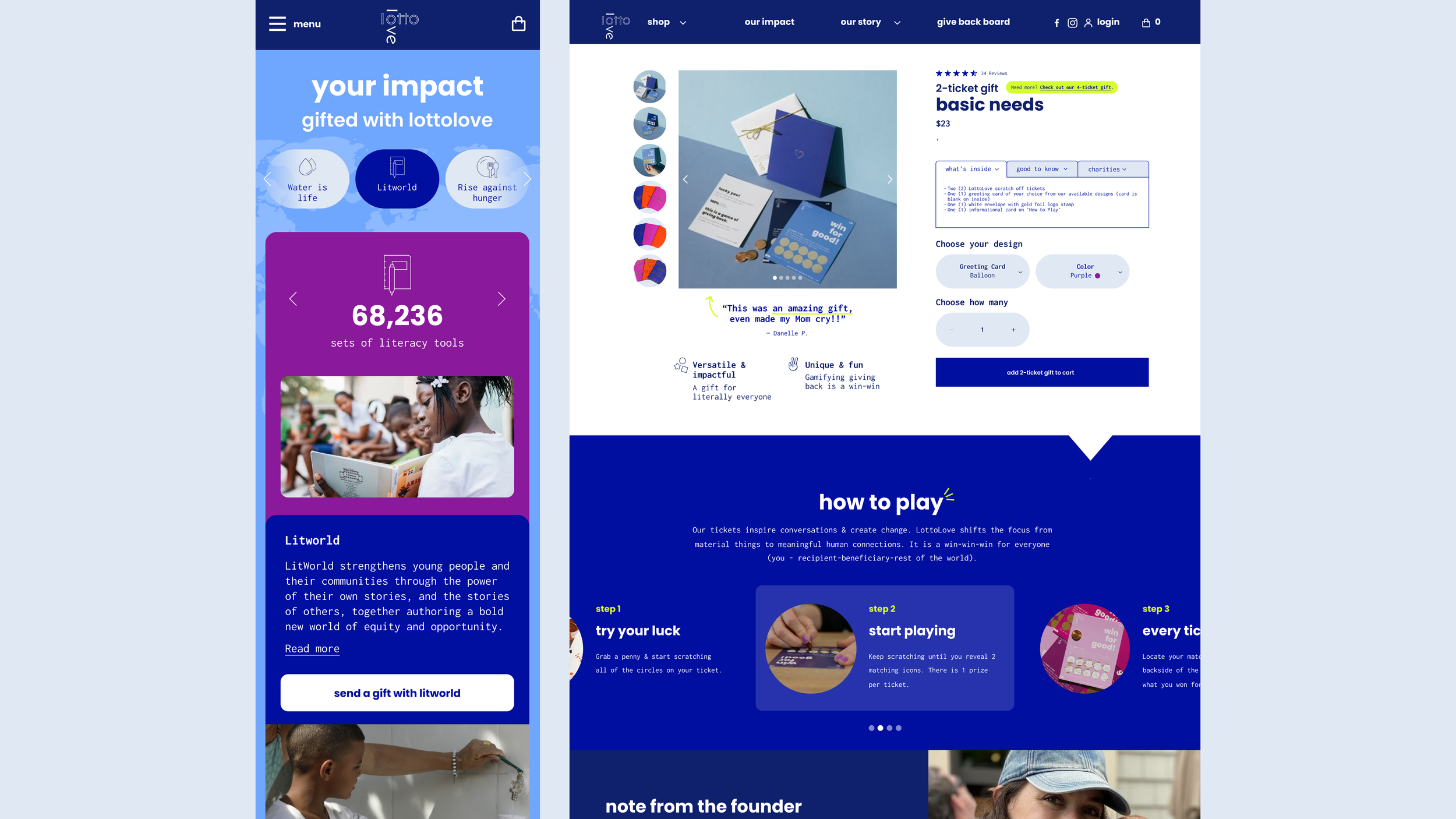 A charitable gift concept in the form of scratch-off tickets, where recipients find that a donation has been made to one of many charities focused on some the following: mitigating hunger in underdeveloped communities, providing education resources for children, and empowering women.