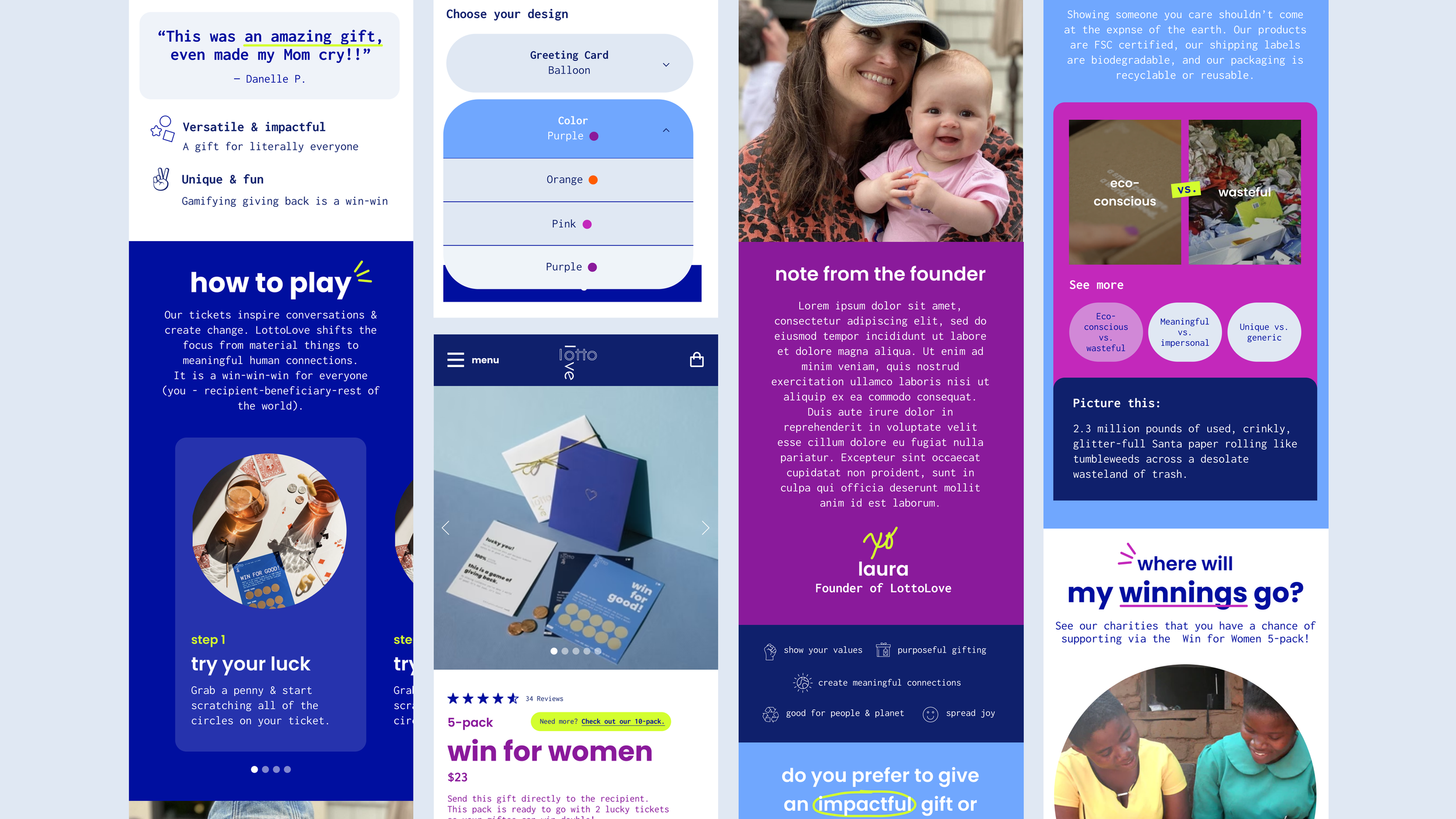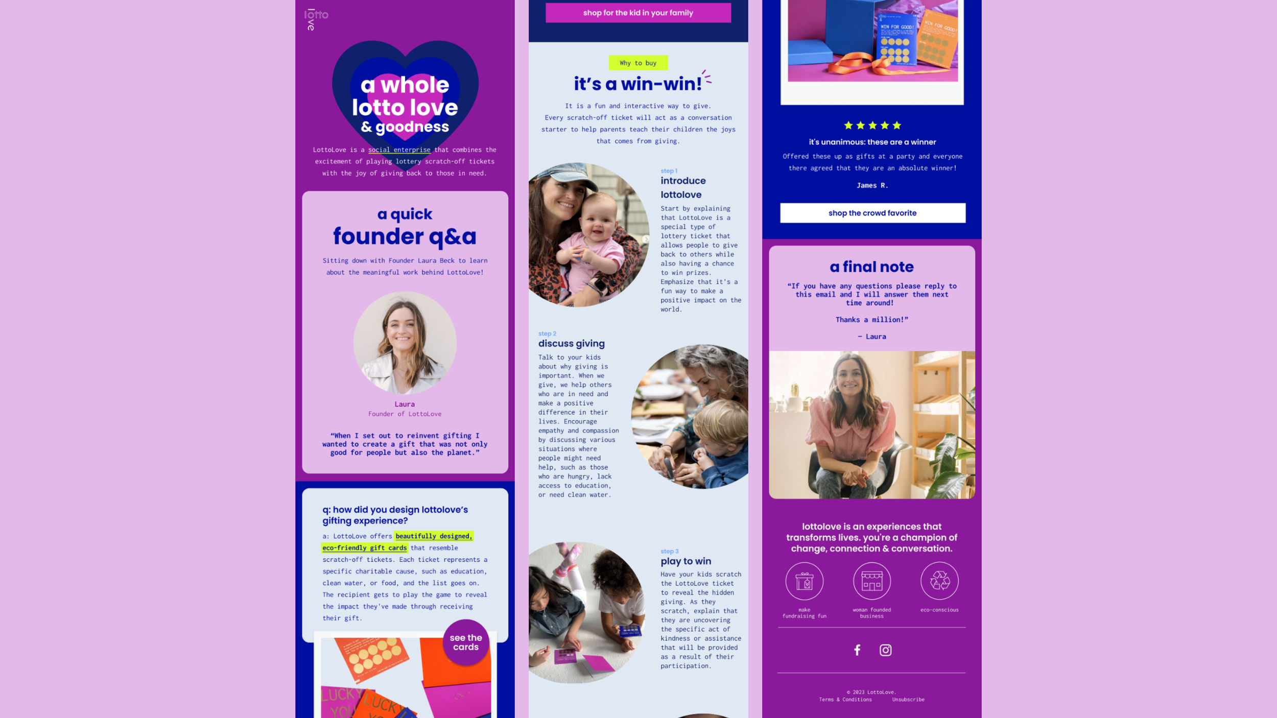 LottoLove had an idea of what colors, fonts, and photography they wanted to use, but wasn’t sure how their visual and brand design would come together across web and email. We collaborated on creating a high-impact, bright, fun, and a playful way to represent LottoLove’s game-inspired product.